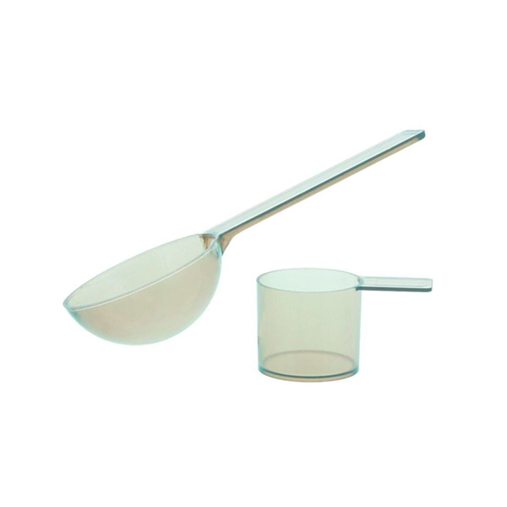 Målebæger og måleske til Simplee alginat, i hård, røgfarvet plast.