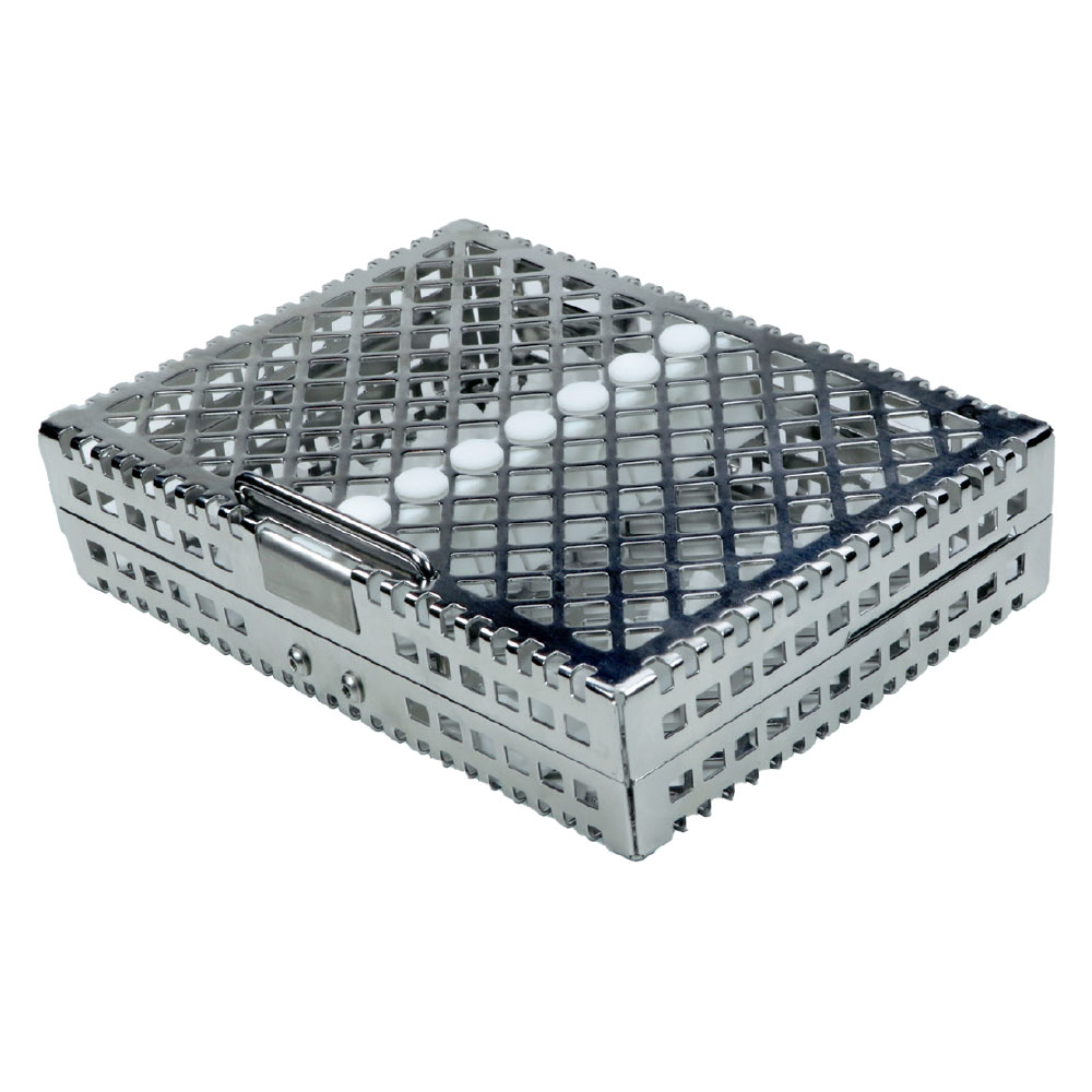 Rustfri stålkassette til 10 instrumenter, 190 x 140 x 34 mm, med hvide silikone instrumentholdere, kassetten er med låg og lukning.