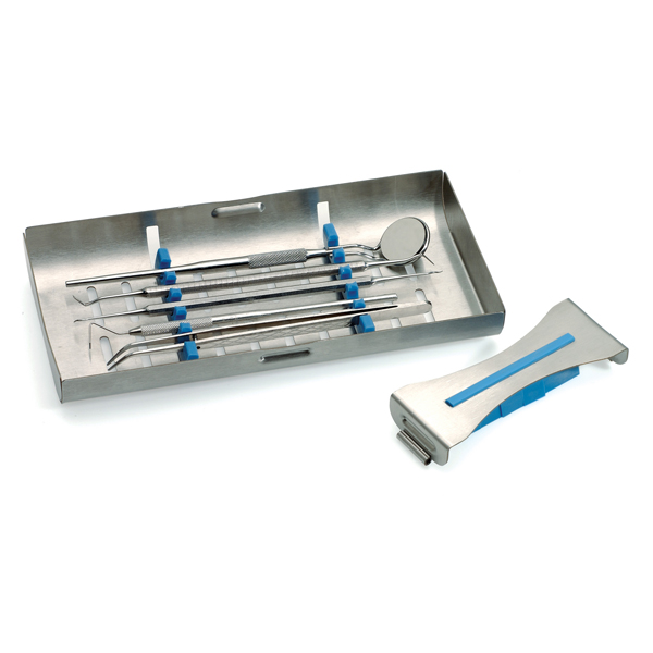 Uperforeret bakke i rustfrit stål, 18,4 x 11 x 2,5 cm, med instrumentholder i blå silikone med plads til 5 instrumenter.