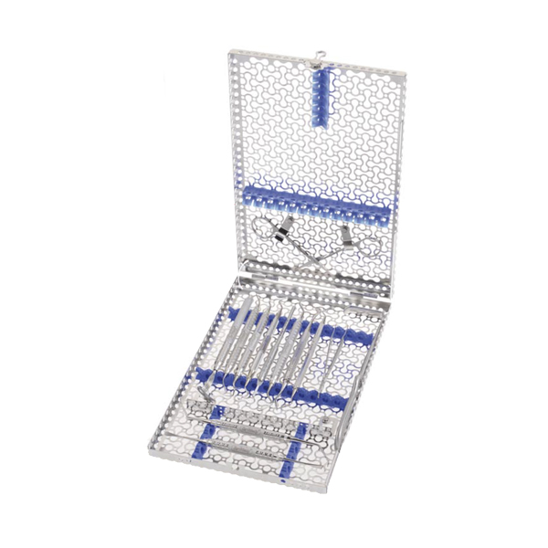 Kirurgi kasette, IMEDIN188S, med plads til 18 instrumenter og ekstra plads samt 4 clips til hængslede instrumenter, i langtidsholbart rustfrit stål, der kræver lav vedligeholdelse og hulmønstret design, der giver 30% flere åbninger, med bløde, farvede silikoneskinner, der holder instrumenterne sikkert fast under hele behandlingscyklussen, mål 290 x 184 x 34 mm, med blå markering.