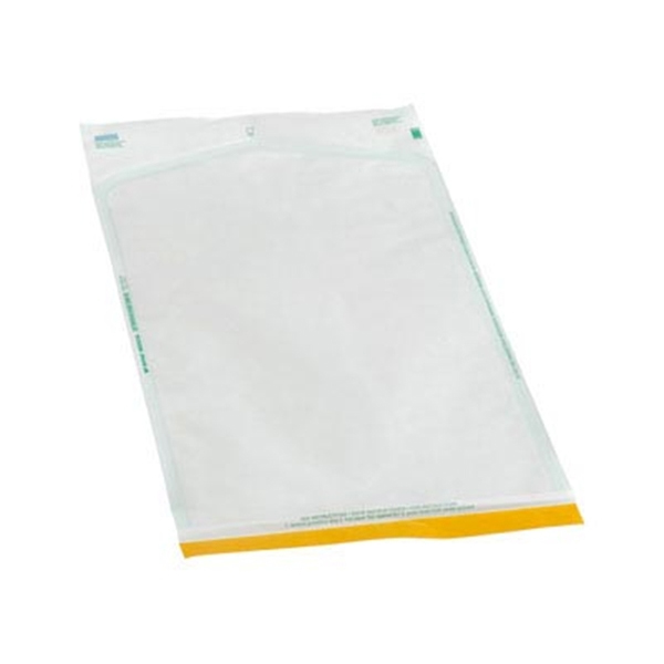 Papir/plast til autoklavering, dampgennemtrængeligt, bakterietæt papir med indikator på den ene side og plast på den anden, med klæb, indermål 22,8 x 32 cm, grøn. Med 3-delt svejsesøm.
