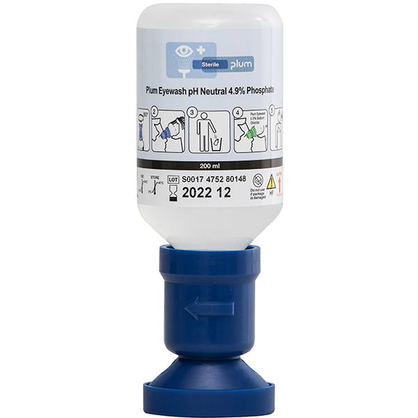 Øjenskylleflaske med 4,9% steril fosfatopløsning og ergonomisk øjenkop, der holder øjet åbent under skylning samt leder væsken væk fra øjet efter skylning. Til ulykker med syrer og baser. Kan kun anvendes én gang da genanvendelse kan give risiko for infektion. Må ikke bruges hvis forseglingen er brudt eller efter holdbarhedsudløb (se etiket). Skylletid ca. 2 minutter.
