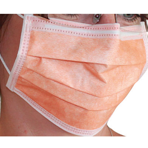 Mundbind, blødt bakterietæt, orange papir med næseklemme og stofelastik, 3-lags. Indeholder IKKE latex, ftalater eller formaldehyd. Type II