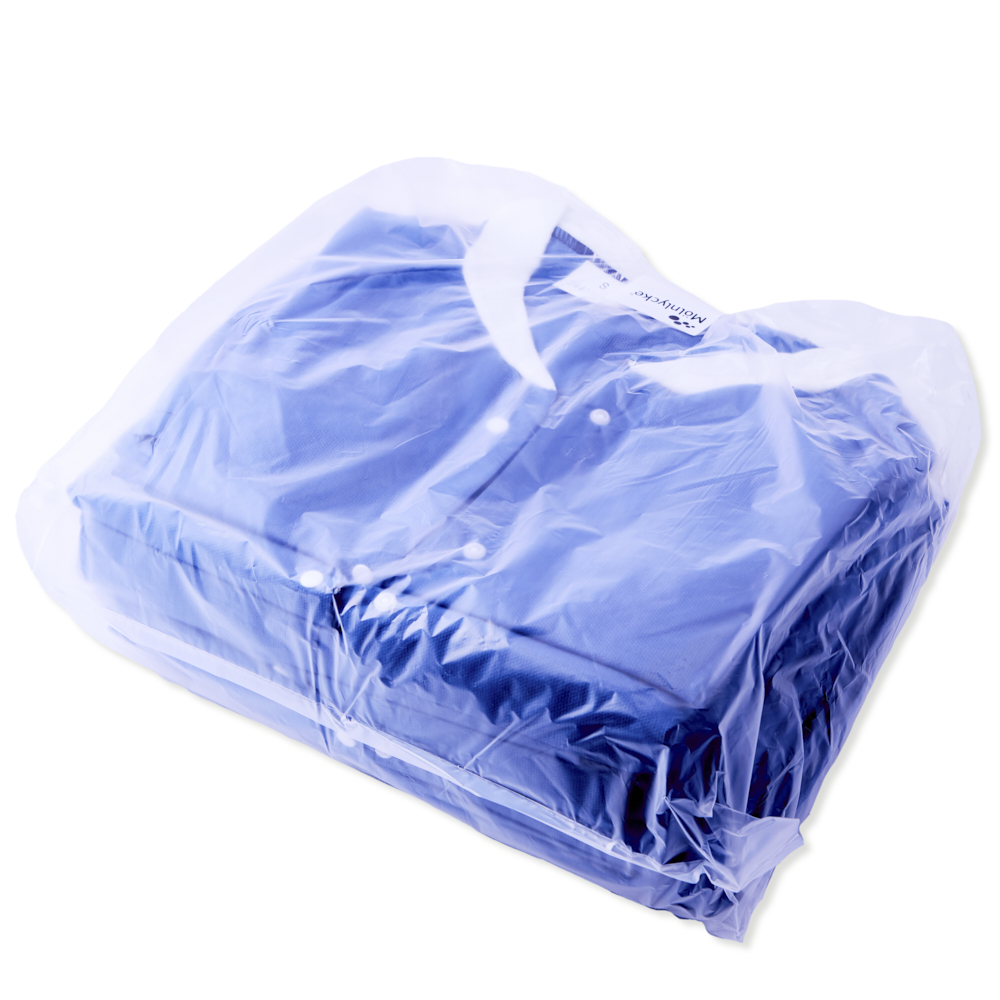 Warm-up jakke til at tage over kitlen for at holde varmen, blå, med lange ærmer, str. S, til engangsbrug, fremstillet af materialer, som fnugger meget lidt, med lavere tør mikrobiel penetration end andre testede genanvendelige produkter.