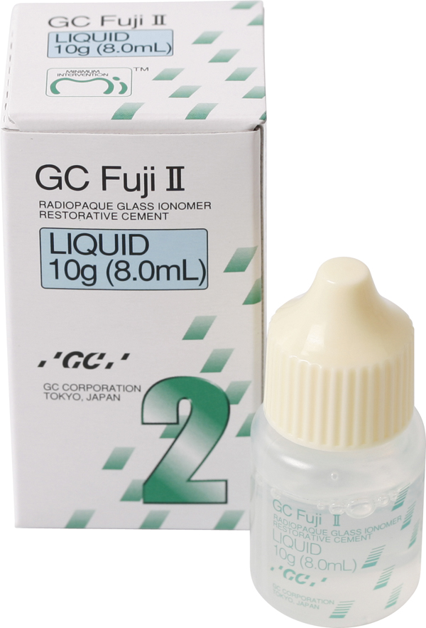 Væske til Fuji II glasionomercement, kemiskhærdende til klasse III og V fyldninger, primære tænder mm.
