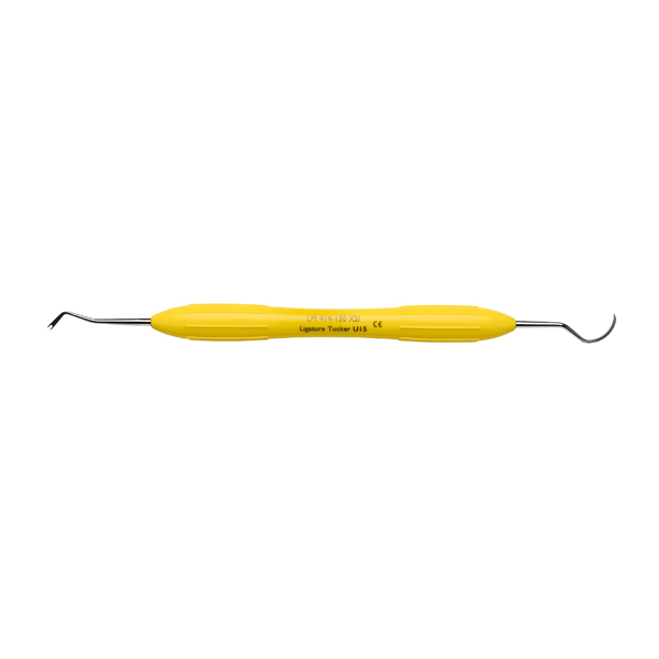 Ortodontiinstrument, dobbeltendet, den en ende (gaffelformet) til anbringelse af ligaturtråd i forbindelse med orthodonti, den anden ende en scaler (U15), Ligature Scaler, 414-150 XSI, gul, ErgoMax silikonegreb.