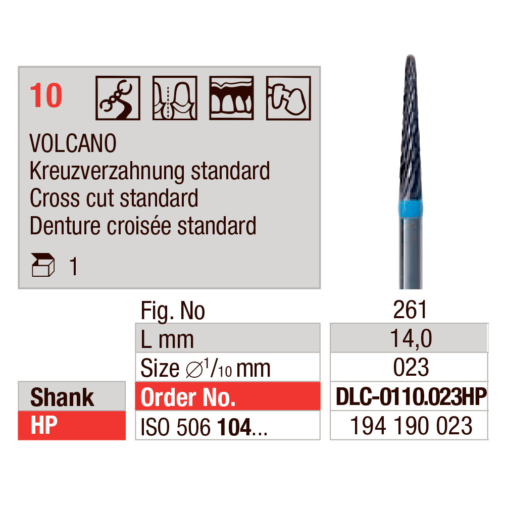 Hårdmetalfræser, Volcano, til behandling af krom-kobolt legeringer, ædelmetal, krom-nikkel legeringer, modelstøbte legeringer og akryler, med kryds-skær og DLC hærdning for at øge yde-evnen samt give en høj skærekapacitet og en maksimal levetid. Til HP, facon 261, tykkelse 023, standard med blå ring, længde på hovedet 14 mm.