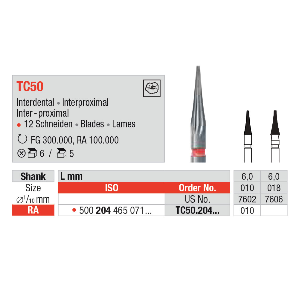 Finerbor til pudsning, hårdmetal, 12-bladede, til RA, til interproximalt brug, med rød ring, str. 010, hovedlængde 6 mm.
