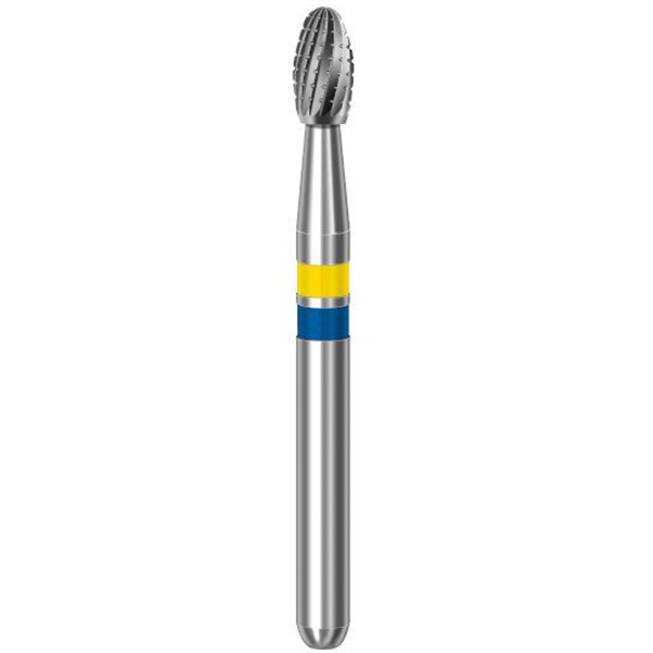 Komet HM Q-finerbor. Til airrotor. Ægge-formet med afrundet top og gul/blå ringmarkering. Længde arbejdende del: 3,5mm. Q-hårdmetalfinerbor med 12 optimerede skær med tværhug. Anvendes i opgearingsvinkelstykke 1:5 (det røde) til renovering, pudsning og polering af komposit ved optimal hastighed: 20.000 rpm. Tåler autoklavering. H397Q.314.018