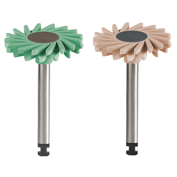 Spiralhjul til polering af restaureringer efter brug af diamanter, til RA, sæt til zirkonium med Zircopol Plus (step 1) grøn og Zircoshine Plus (step 2) hvid.