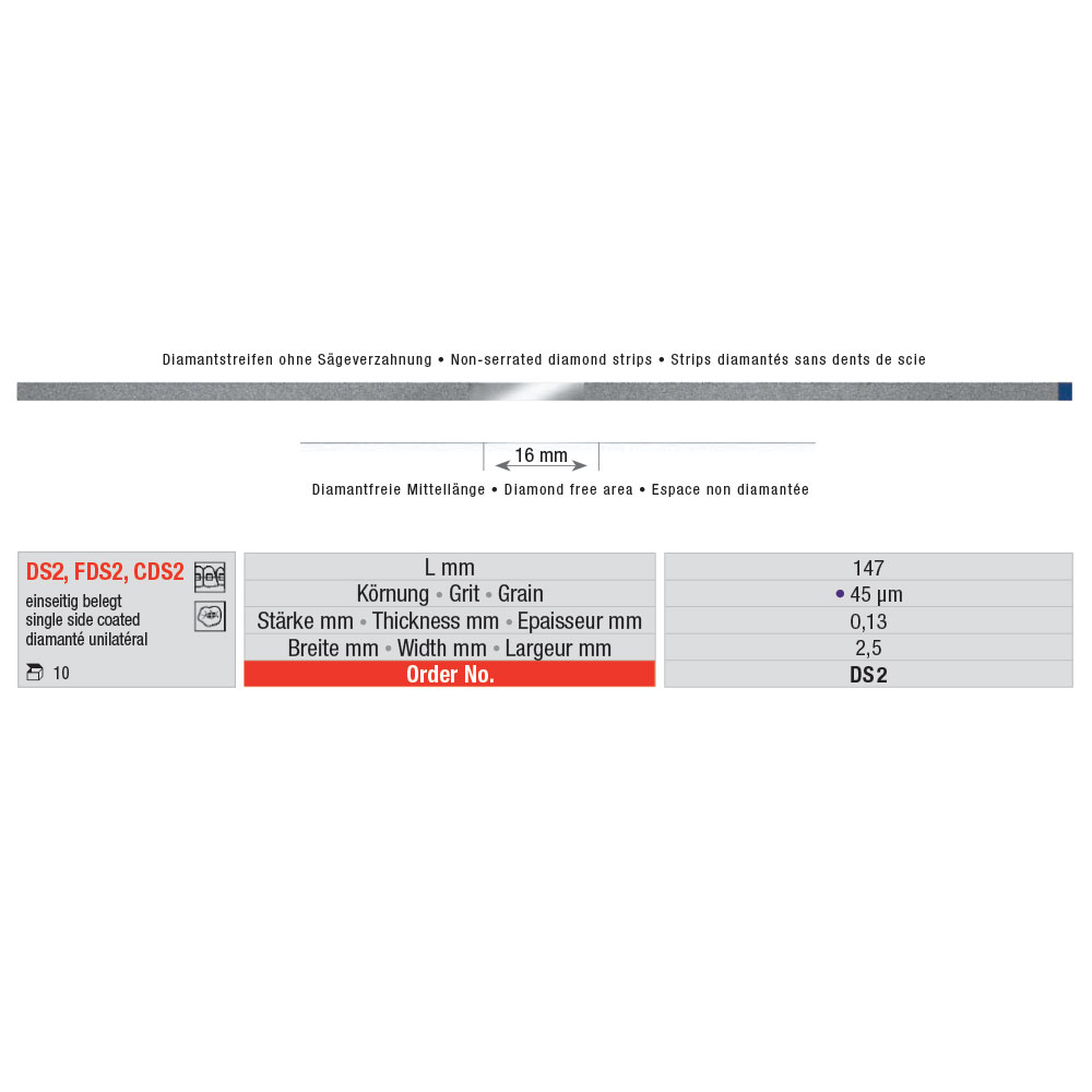 Diamant pudsestrips, enkeltslibende (ensidet), bredde 2,50 mm , længde 147 mm, med midterstykke uden diamantbelægning (16 mm), standard blå, (45 my i kornstørrelse), tykkelse 0,13 mm, DS2.