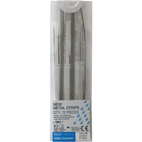 Tynde, fleksible stålstrips til approksimal pudsning fx efter cementeringer af porcelænsrestaureringer, blå, grove, 90 micron, #300 Mesh, til præparation, kan autoklaveres.