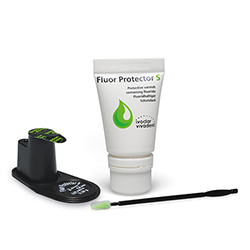 Fluorholdig beskyttelseslak for desensibilisering samt kariesprofylakse, transparent, indeholder 7700 ppm fluor, med mild smag og duft, i single dose, refill.
