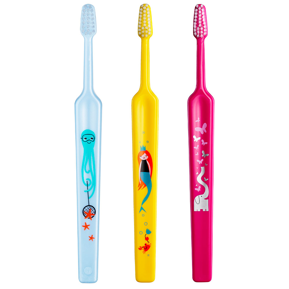 Tandbørste, Select Compact med kompakt, konisk børstehoved, som kan vinkles, afrundede børstehår samt ergonomisk skaft med illustrationer, soft. Velegnet til brug af børn fra 3 år og op. Pakket enkeltvis i cellofan pakninger.
