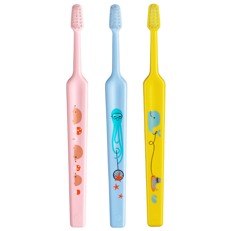 Tandbørste til børn fra 0-4 år, med lille, konisk børstehoved, som kan vinkles, afrundede børstehår samt ergonomisk skaft med print, Mini, x-soft, i blister pakninger.