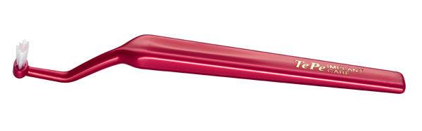 Specialbørste til brug ved implantater, med vinklet hals og lille ovalt børstehoved med lange børstehår, Implant Care.