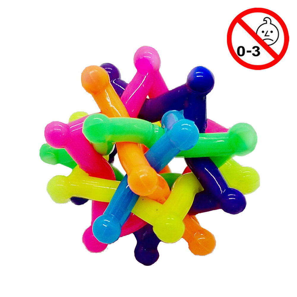 Hoppebold i silikonegummi, består af femtakkede stjerner, der tilsammen danner en bold, multifarvet. Enkeltpakkede.