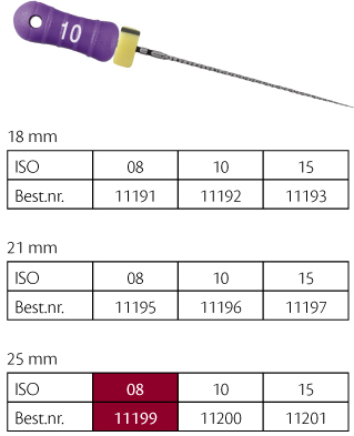 C+ file i rustfrit stål (særligt behandlet stål så filen bliver ultra stiv) med farvet plasthåndtag, anvendes til at skabe adgang til rodkanalen, særligt velegnede til oprensning af calcificerede kanaler, 25 mm, nr. 08, grå. Ready Steel- sterilt pak- ket i blisterpakninger.