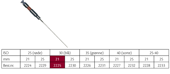 Rodfyldningsspiraler, fleksibel med fjeder-effekt tættest på skaftet, svarer til de tidligere rodspiraler fra VDW, metalskaft, 21 mm, nr. 30, blå.