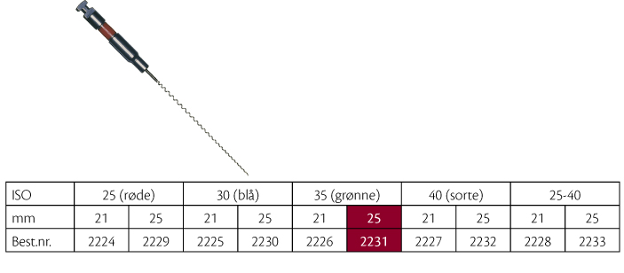 Rodfyldningsspiraler, fleksibel med fjeder-effekt tættest på skaftet, svarer til de tidligere rodspiraler fra VDW, metalskaft, 25 mm, nr. 35, grøn.