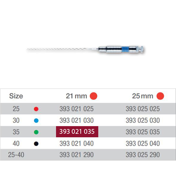 Rodfyldningsspiraler med metalskaft, 21 mm, nr. 35, grøn. Sterilt enkeltpakkede.