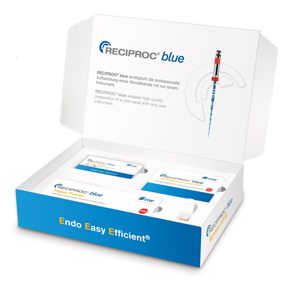 Reciprokerende nikkeltitaniuminstrumenter, Reciproc Blue, til mekanisk udrensning af rodkanalen, af varmebehandlet nikkeltitanium, hvilket giver den blå farve. Er stærkere, mere fleksible og har større modstandsdygtighed overfor filfraktur. Desuden . er det muligt at forbøje filen for at lette adgangen i krumme kanaler. Sterile til brug på én patient. Systemkit. Sterilt enkeltpakket.