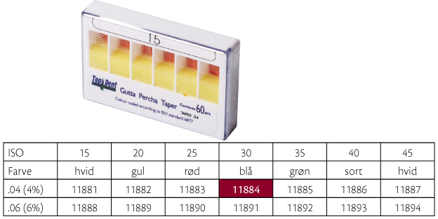 Guttaperkapoints, til rodfyldning hvor der er anvendt fx SystemGT, Profile, Protaper eller andre nikkeltitaniuminstrumenter, farvekodede i toppen, GT .04, 28 mm, nr. 30, blå.
