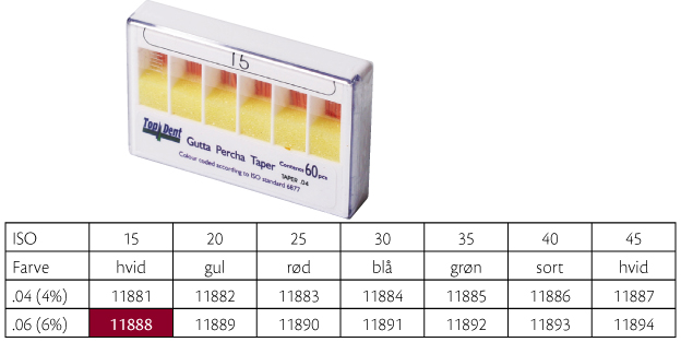 Guttaperkapoints, til rodfyldning hvor der er anvendt fx SystemGT, Profile, Protaper eller andre nikkeltitaniuminstrumenter, farvekodede i toppen, GT .06, 28 mm, nr. 15, hvid.