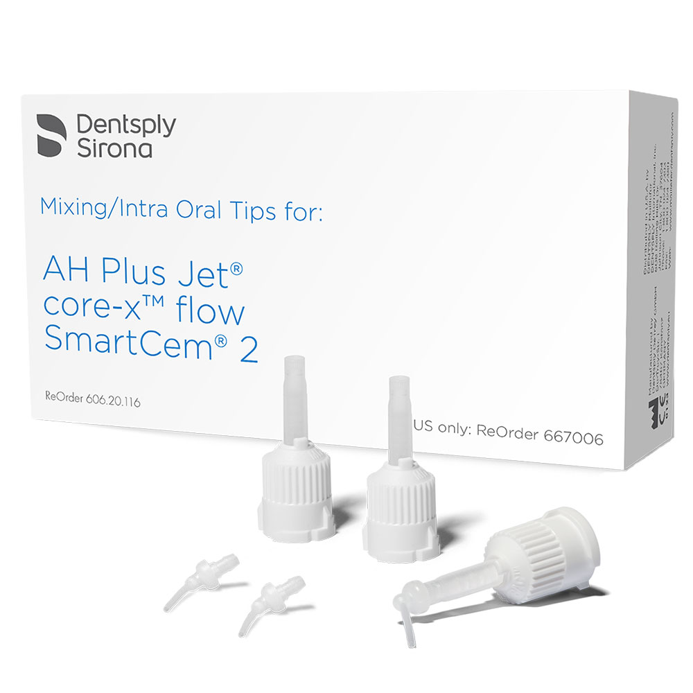 Blandespidser til AH Plus Jet med hvidt gevind og hvid spiral (længde 21 mm) samt intraorale spidser (længde 13 mm).