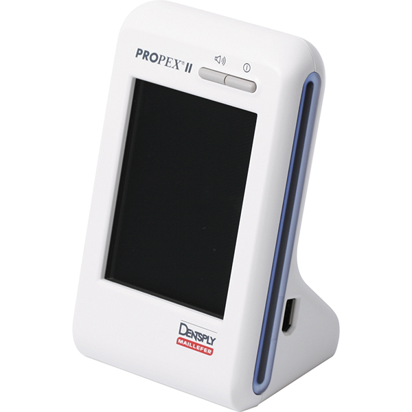 Apparat til elektrometrisk registrering af rodlængden, med digitalt farvedisplay, der viser afstanden til apex, lydsignalet kan indstilles på 3 niveauer, transportabel, 78 x 80 x 123 mm, med genopladeligt batteri.