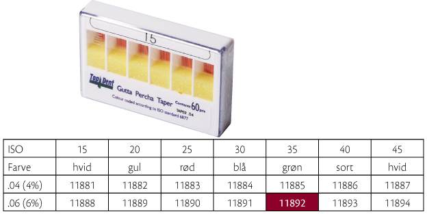 Guttaperkapoints, til rodfyldning hvor der er anvendt fx SystemGT, Profile, Protaper eller andre nikkeltitaniuminstrumenter, farvekodede i toppen, GT .06, 28 mm, nr. 35, grøn.