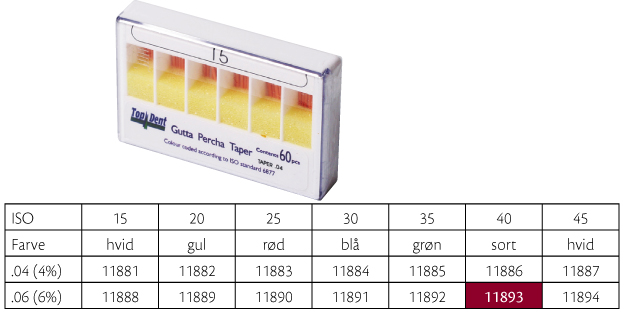 Guttaperkapoints, til rodfyldning hvor der er anvendt fx SystemGT, Profile, Protaper eller andre nikkeltitaniuminstrumenter, farvekodede i toppen, GT .06, 28 mm, nr. 40, sort.
